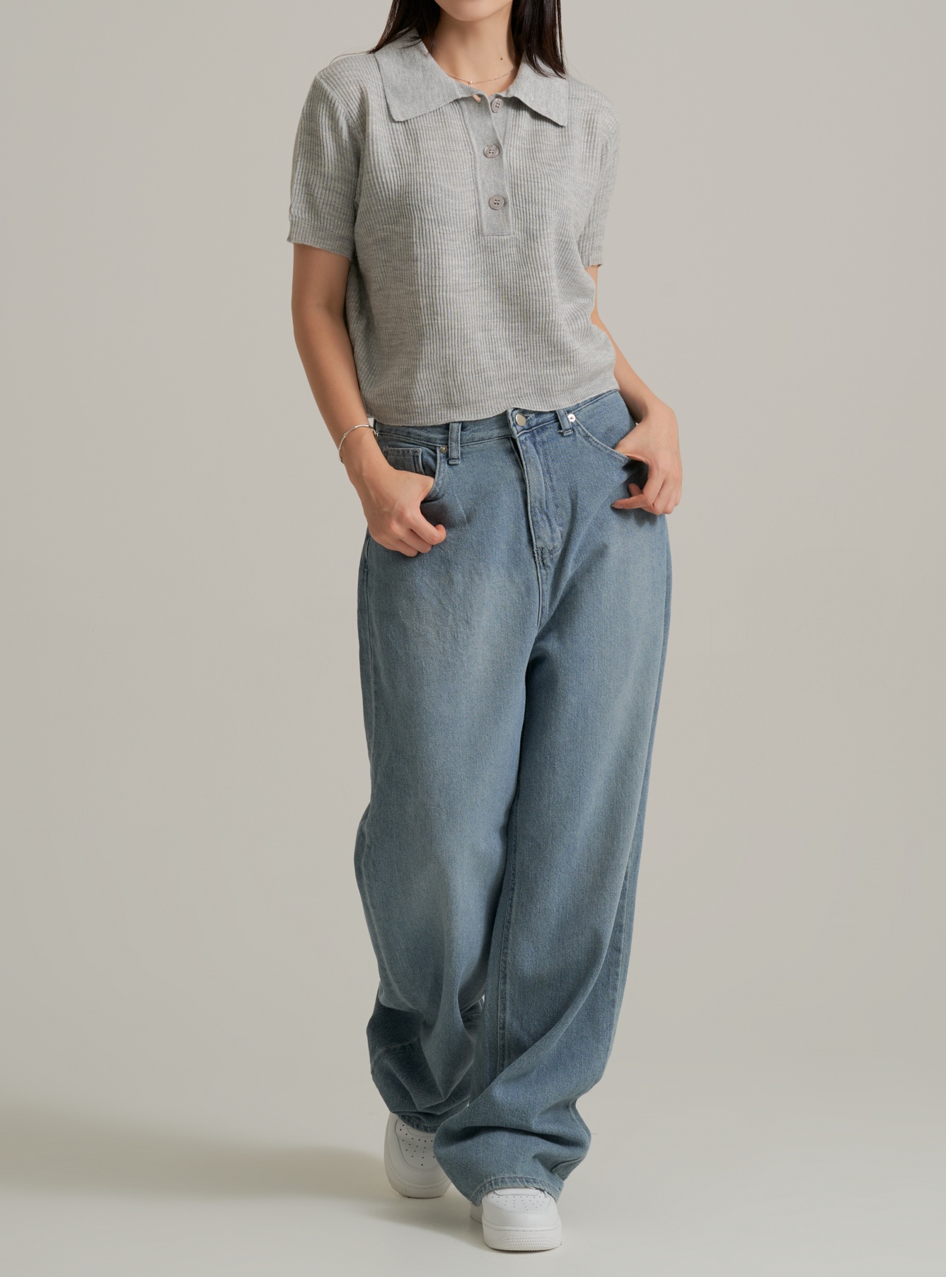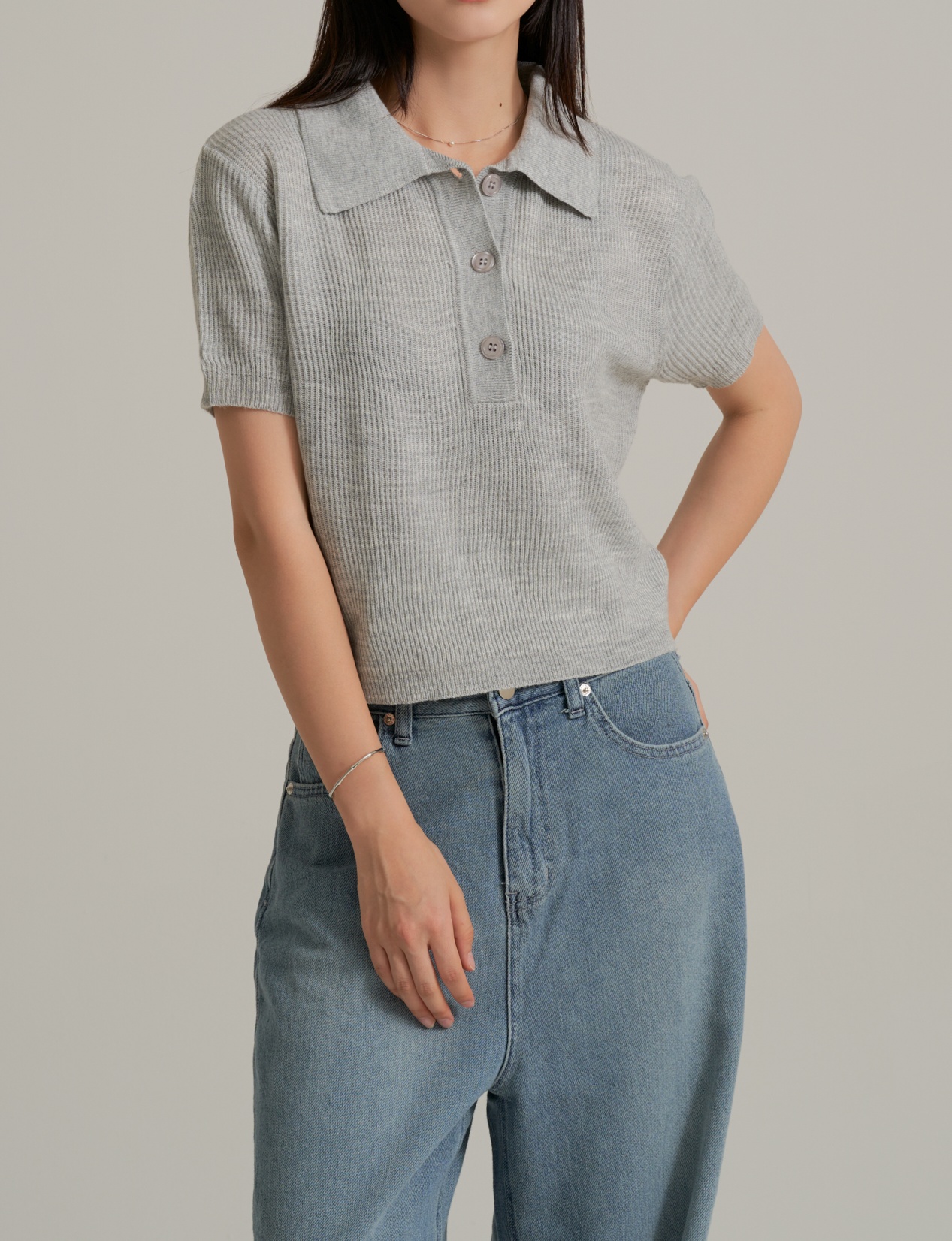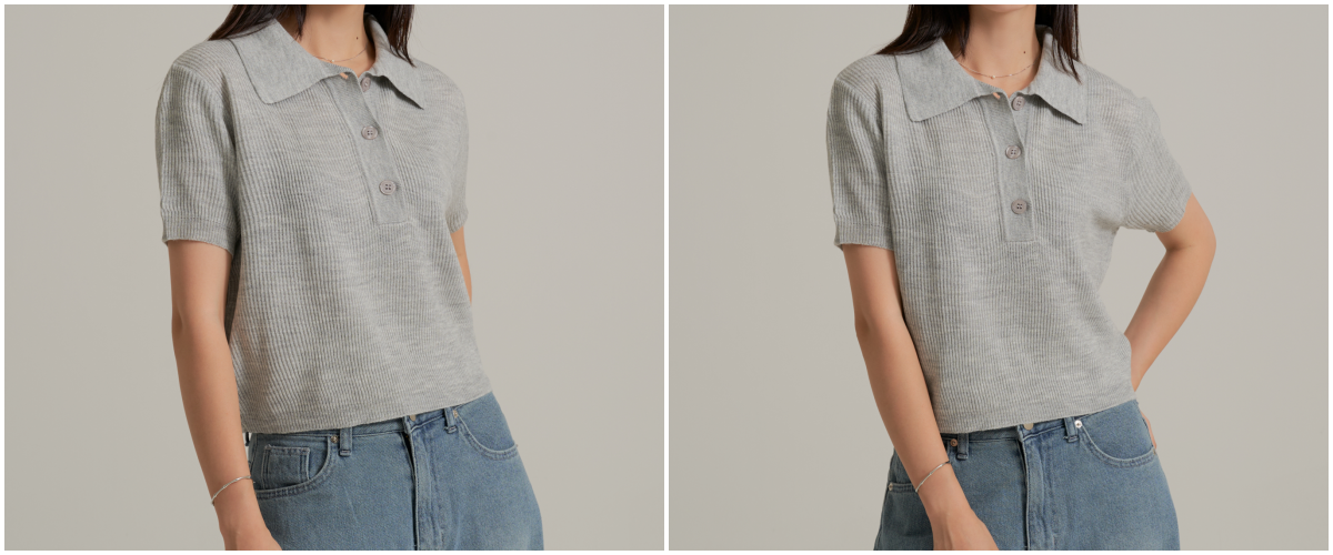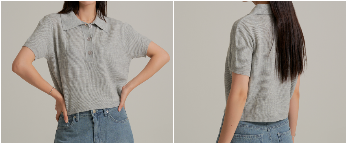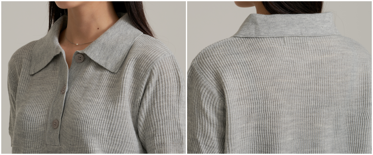 제품은 기본 카라가 달린 니트 소재의 상의와