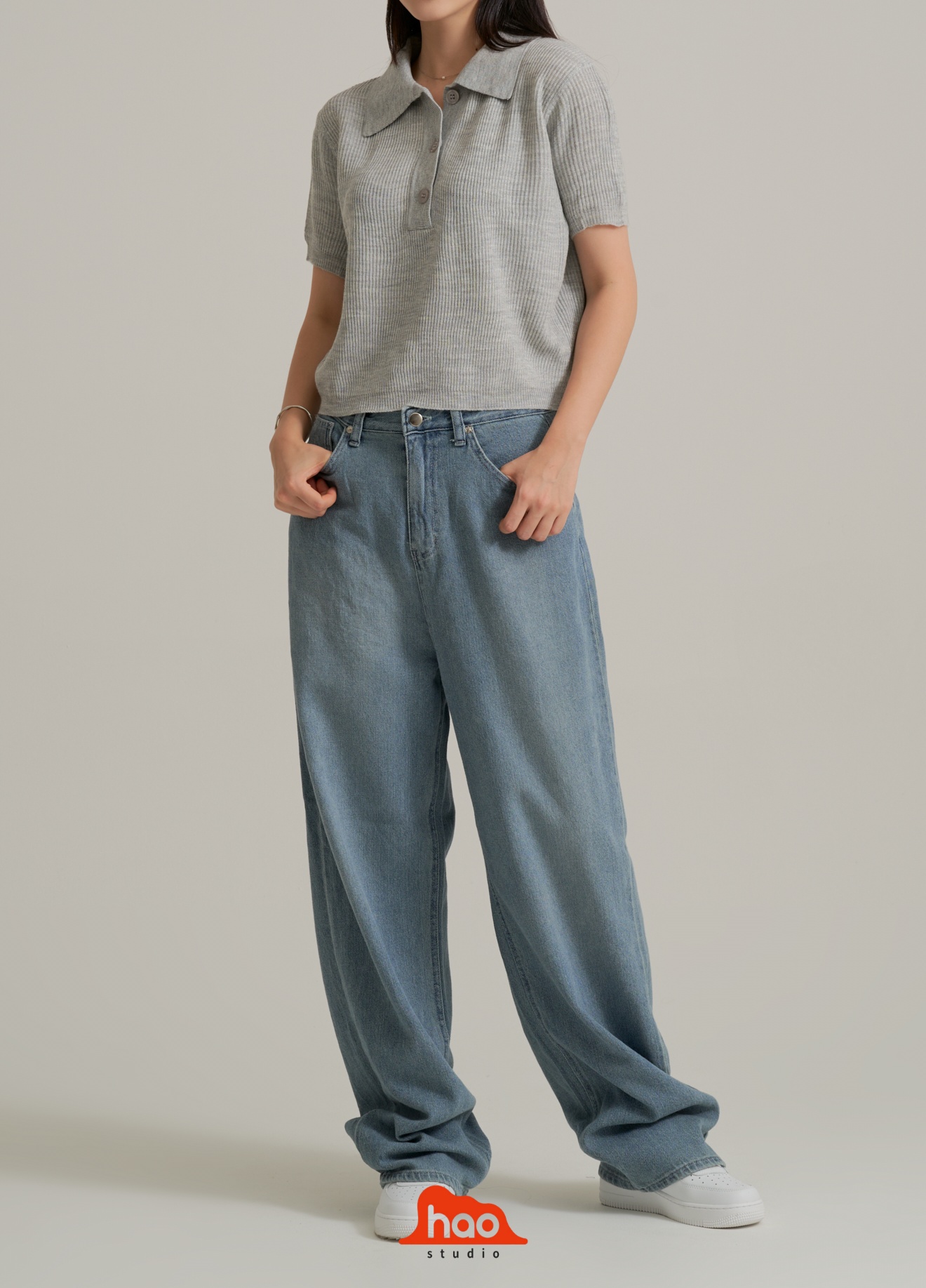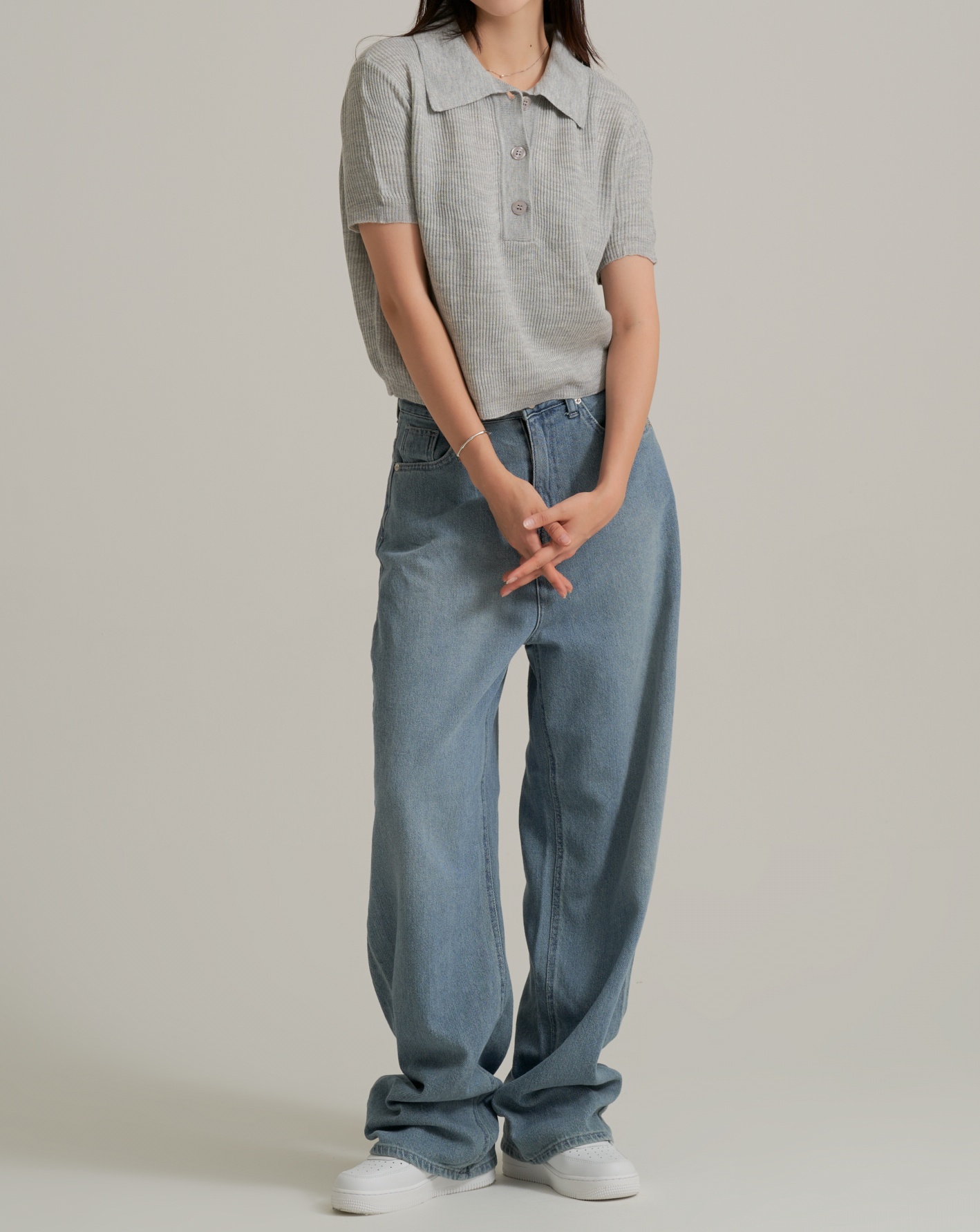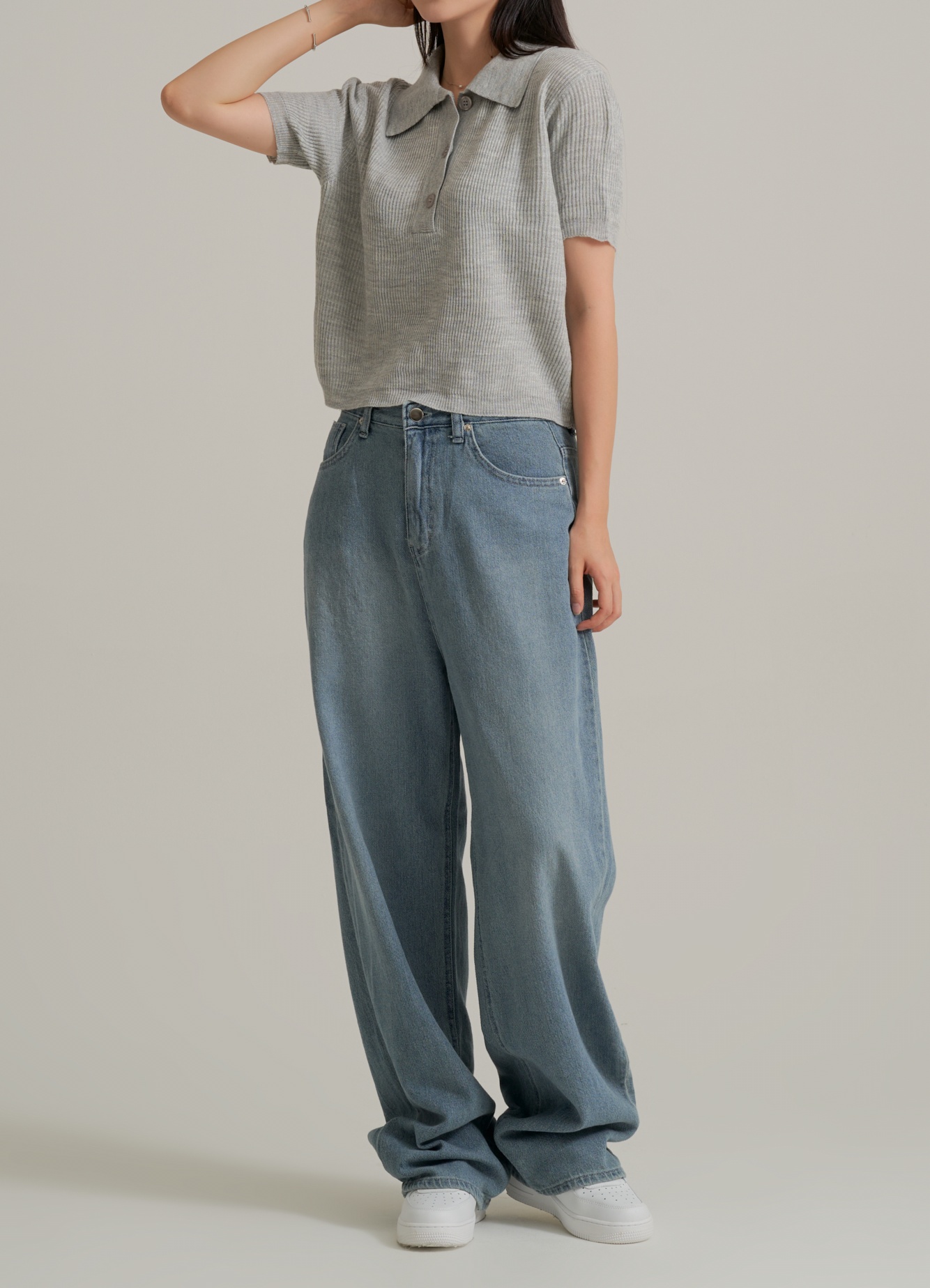 제품은 기본 카라가 달린 니트 소재의 상의와